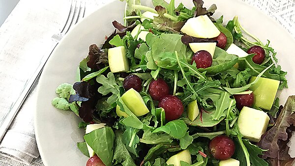 Quasi tutte le mattine mi preparo anche un'insalata per colazione. Prova anche tu: un piatto di insalatina verde, rucola piccante, mele verdi a dadini e uva dolce, con una spruzzata di aceto balsamico. Per iniziare la giornata in modo rinfrescante.